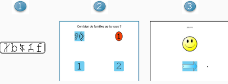 À chaque essai, une séquence de caractères s’affiche pendant un temps limité. Les enfants doivent répondre à une question qui est posée à la disparition de la séquence (ex : combien de lettres as-tu vu ?)