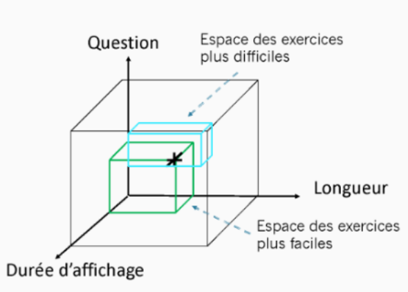 L’algorithme peut définir l’espace des exercices légèrement plus difficiles et celui des exercices légèrement plus faciles. Il choisira un exercice au hasard dans l’un de ces espaces selon que l’enfant réussit ou pas l’essai en cours.