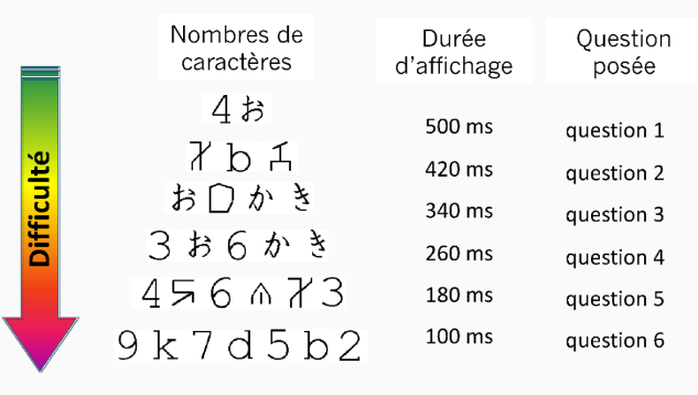 Pour gérer la difficulté d’un exercice, il faut prendre en compte les 3 dimensions (longueur de la séquence, temps d’affichage et question posée) en même temps. C’est en général plus facile de traiter une séquence de 2 caractères qu’une séquence de 4, mais ça ne l’est pas nécessairement si la première est présentée en 100ms et la deuxième en 500ms. De la même façon, répondre à une des questions est plus ou moins facile selon la longueur de la séquence et le temps d’affichage.