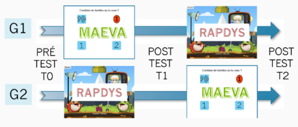 – Le premier groupe de 23 enfants commençait par d’entrainer sur le logiciel MAEVA puis il s’entrainait sur un logiciel contrôle, le logiciel RAPDYS d’entrainement à la perception catégorielle développé par Willy Serniclaes et Grégory Collet. On l’appellera le groupe MAEVA – RAPDYS.